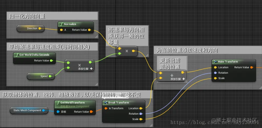 在网格右键搜索并创建“Make Transform”节点(暂存最新的位置、旋转、缩放信息)、“Vector*float"节点(将方向与速率相乘得到位移量)、“Vector+Vector”节点(将物体当前位置加上位移量得出下一帧物体的位置),作如下连接: