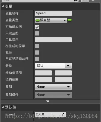 (2)设置变量,选中左侧的“Speed”变量,然后在右边的“细节”面板设置变量类型为浮点型,并点击勾选“可编辑实例”,编译后设置默认值改变为200,操作结果如下: