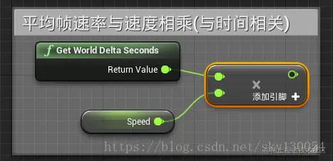 点击拖拽左侧“我的蓝图”中的Speed变量到网格中选择“获取”,然后右键网格搜索并创建“Get World Delta Seconds”节点(可使每一帧物体移动速度一致),再右键网格搜索并创建“float*float节点”如图所示: