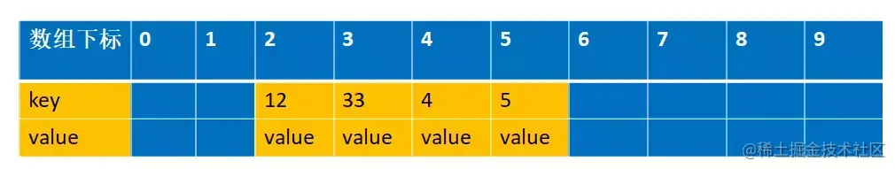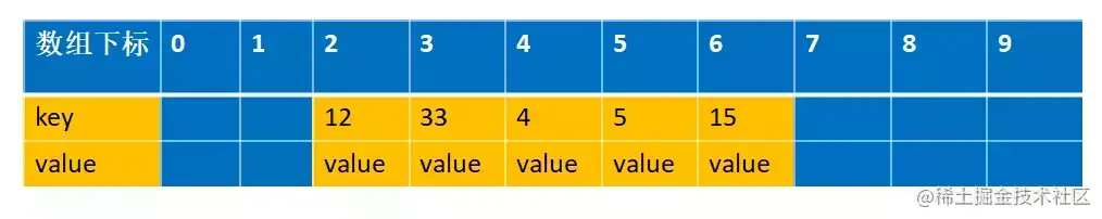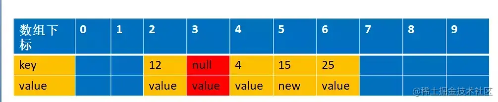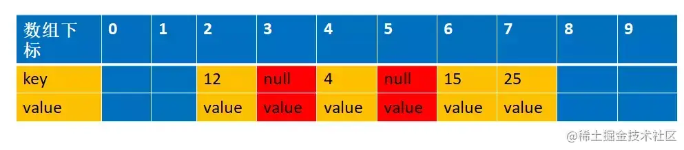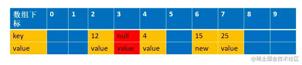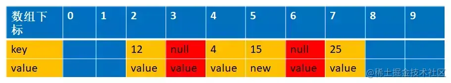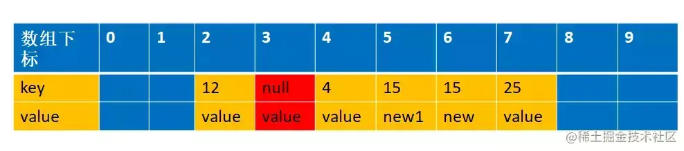 还是拿上面解释开放地址法解释的例子来说明下。 比如说,我们的关键字集合为{12,33,4,5,15,25},表长为10。 我们用散列函数f(key) = key mod l0。 当计算前S个数{12,33,4,5,15,25}时,并且此时key=33,k=5 已经过期了(蓝色代表为空的,可以存放数据,红色代表key 过期,过期的key为null):