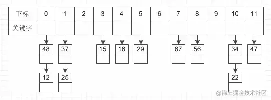 这种方法的基本思想是将所有哈希地址为i的元素构成一个称为同义词链的单链表,并将单链表的头指针存在哈希表的第i个单元中,因而查找、插入和删除主要在同义词链中进行。列如对于关键字集合{12,67,56,16,25,37, 22,29,15,47,48,34},我们用前面同样的12为除数,进行除留余数法: