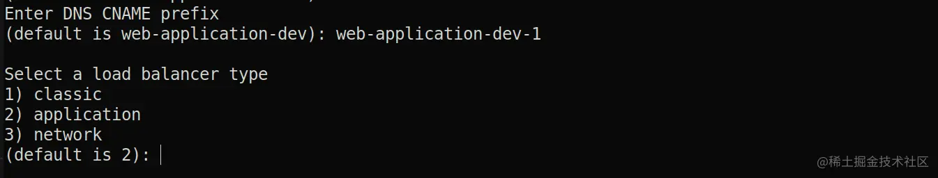 然后在这里输入DNS名称。选择一个负载平衡器类型:让我们用默认的,也就是应用程序。
