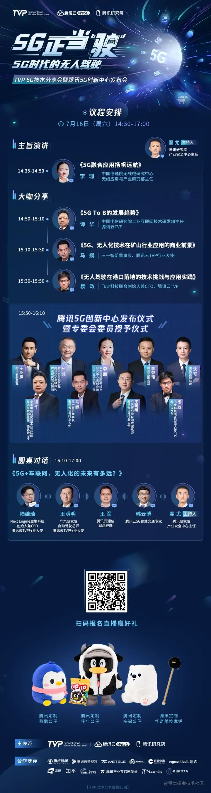 7 月 16 日(周六)下午 14:30-17:00,「5G 正当“驶”——5G 时代的无人驾驶」TVP 5G 技术分享会暨腾讯 5G 创新中心发布会将在「腾讯云TVP」视频号等多平台同步直播,扫描下方「海报二维码」或点击「阅读原文」即可报名,与大咖相约,见证腾讯5G创新中心的发布!