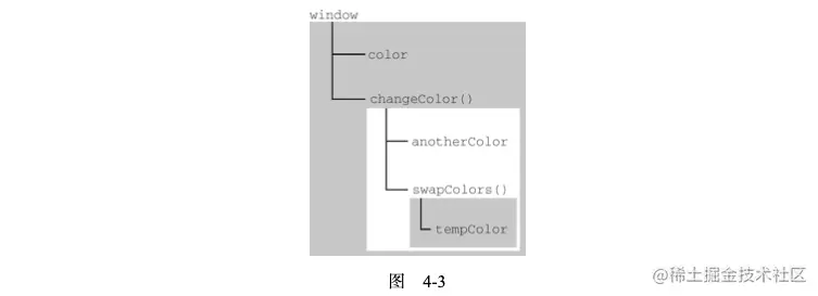 图 4-3 中的矩形表示不同的区域。内部区域可以通过作用域链访问外部区域中的一切,但外 部区域无法访问内部区域中的任何东西。区域之间的连接是线性的、有序的。每个区域都可以 到上一级区域中去搜索变量和函数,但任何区域都不能到下一级区域中去搜索。swapColors() 局部区域的作用域链中有 3 个对象:swapColors()的变量对象、changeColor()的变量对象和全局 8 变量对象。swapColors()的局部区域首先从自己的变量对象开始搜索变量和函数,搜不到就去搜索 上一级变量对象。changeColor()区域的作用域链中只有 2 个对象:它自己的变量对象和全局变量 对象。因此,它不能访问 swapColors()的区域。