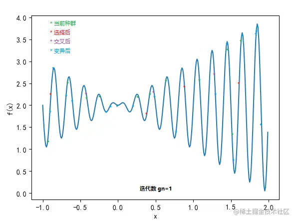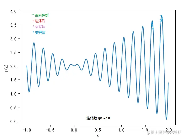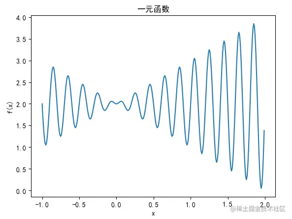 一元函数:f(x) = x*sin(10*pi*x)+2, -1<x<2,目标是找到 最大值,这个函数图示意如下: