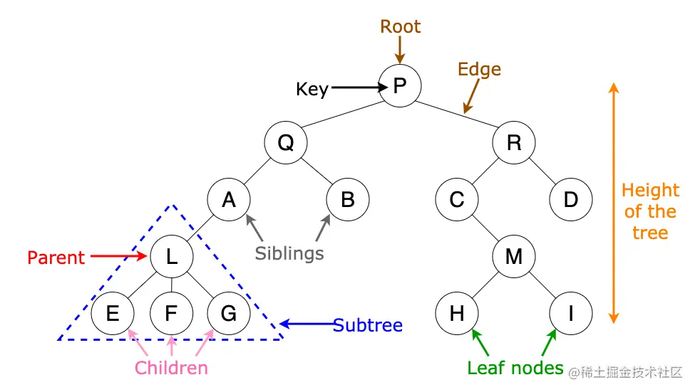 如上图所示,树是一种数据结构。每个节点都包含数据和一个键。第一个节点被称为 "根 "节点。从这里开始,其余的节点都是分支。作为同一父节点的子女的节点是兄弟姐妹。没有子节点的节点被称为叶节点,位于特定分支的末端。正如你所看到的,它被称为树的原因是显而易见的。