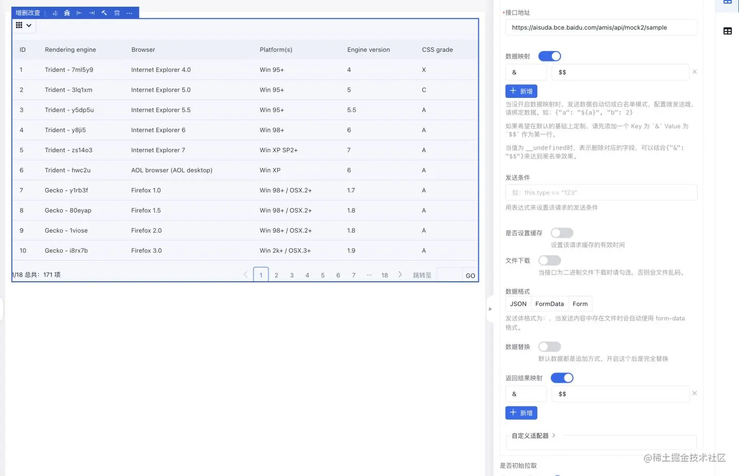 需要注意的是这个 “映射” 是在数据接口请求发送之前 / 返回之后在浏览器端进行的格式化,所以设置之后观察接口返回数据也不会看到任何改变。该能力是在 AMIS 框架中实现的,爱速搭对其进行了可视化封装,关于 AMIS 框架中的实现,可以阅读官方文档:aisuda.bce.baidu.com/amis/zh-CN/…