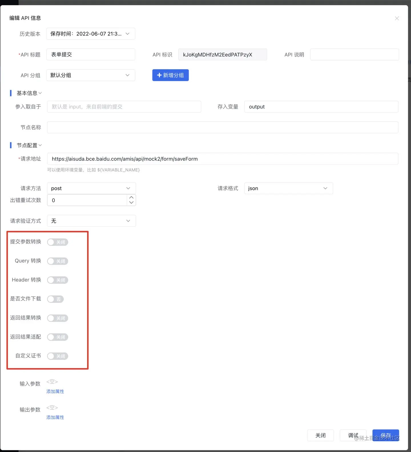 此外,爱速搭还开放了自定义 header 等请求信息的配置能力,由于篇幅所限,本文不再一一赘述,有兴趣的读者可自行查阅爱速搭或 AMIS 官方文档。