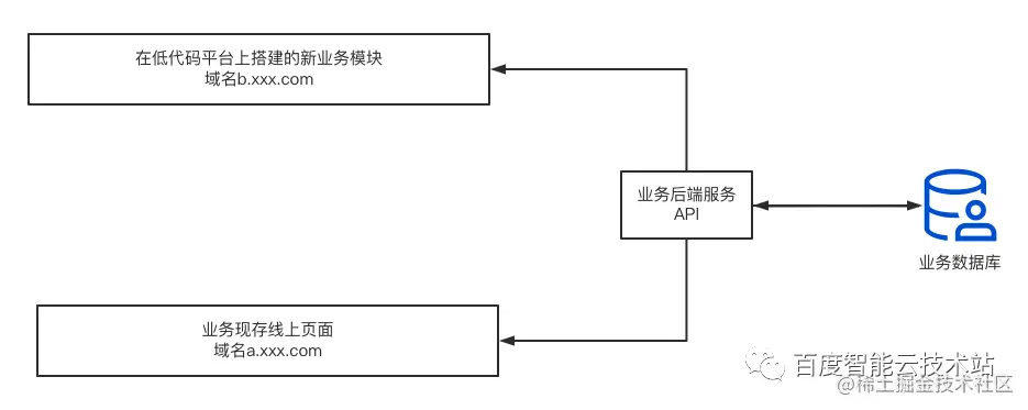 在低代码平台实际业务落地的过程中,多数时候面对的场景都不是 “从零开始” 用低代码平台去搭建一个应用,而是 “将某些业务模块逐步迁移到低代码平台”。这就意味着低代码平台需要和许多已经在线上运行的旧接口打交道。在业务逐步往低代码迁移的过程中,很长一段时间内可能是如图 2 所示的状态 —— 低代码平台需要去连接一些仍在支持线上业务的接口,同时这些接口也仍在支撑着运行中的线上业务,这就意味着不能为了 “接入低代码平台” 而贸然对这些接口进行改造。