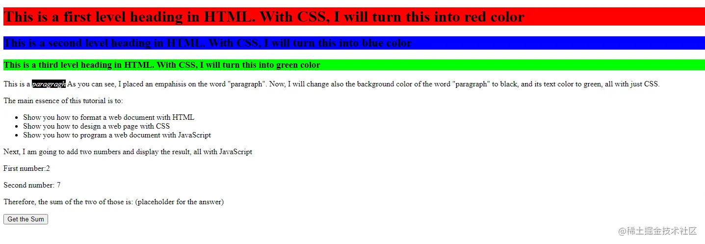 如果你还记得我们的HTML网页的例子,我提到我要把页面上显示的两个数字相加,然后把结果显示在占位文本的位置。一旦按钮被点击,计算就会运行。