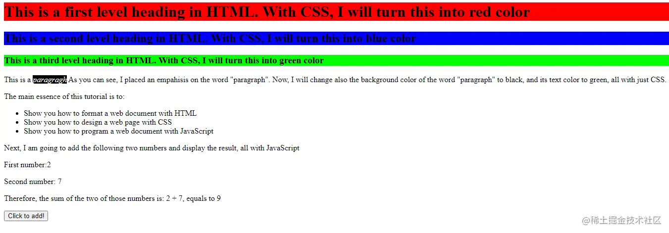 <p>Next, I am going to add the following two numbers and display the result, all with JavaScript<p/>