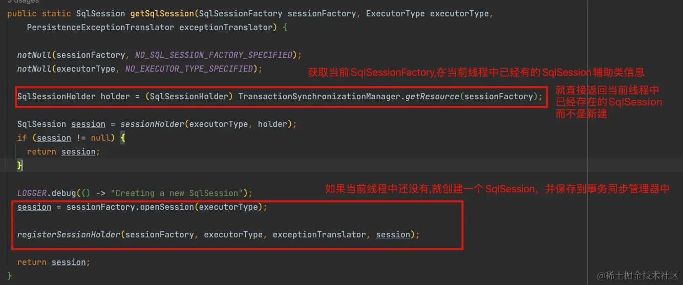- 获取当前线程是否已经有SqlSession了,如果有就直接使用,这样就保证在切面中的事务用的是同一个事务了。