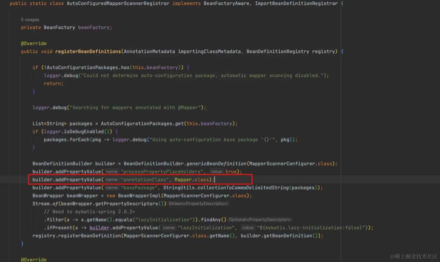 从源码中能看到Mybatis的很多配置信息,都会被注入到MapperScannerConfigurer中。