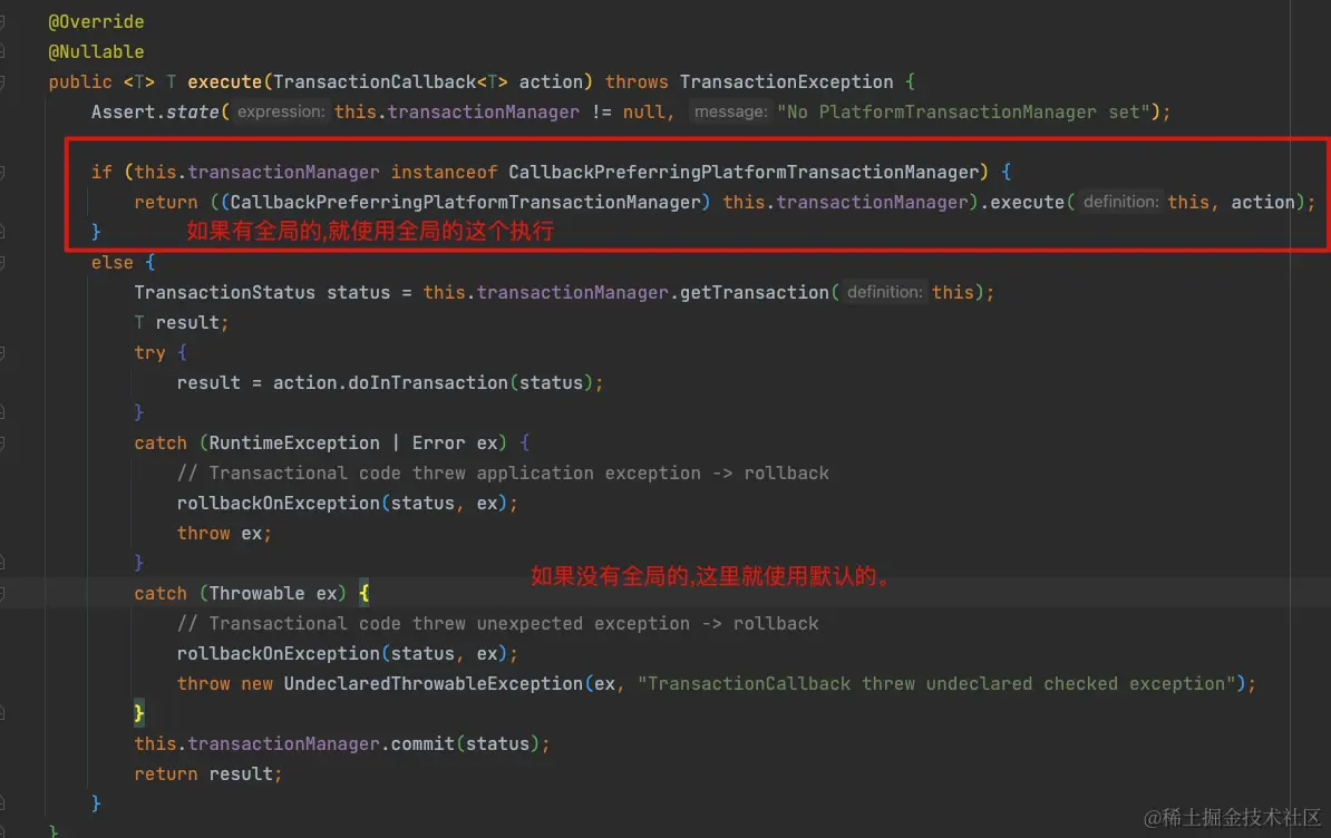 就直接调动全局的这个事务管理方法。如果不是就自己来处理。这种设计的好处是,事务管理器既可以做关系型数据库的事务管理,也可以满足一些特定场景的事务控制(eg: 给Kafka的逻辑做一个事务管理)。