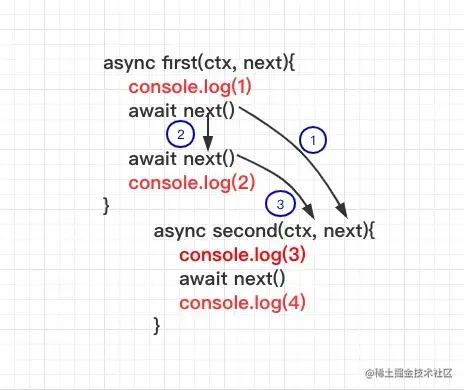 - 一般的中间件都会执行两次,调用next之前为第一次,调用next时把控制传递给下游的下一个中间件。当下游不再有中间件或者没有执行next函数时,就将依次恢复上游中间件的行为,让上游中间件执行next之后的代码;