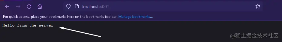 通过上面的示例代码,我们的服务器将监听4001端口,然后在我们访问该端口时向我们发送一个 "来自服务器的你好 "的响应。