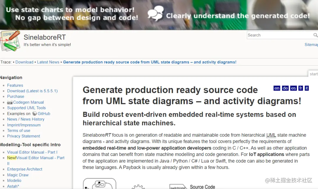 状态机图和活动图代码生成工具。先在EA、Visual Paradigm 、Cadifra、UModel、Magic Draw、ArgoUML等UML建模工具中建立状态机模型,然后导出为XMI文件。sinelaboreRT将XMI文件导入,生成源代码。