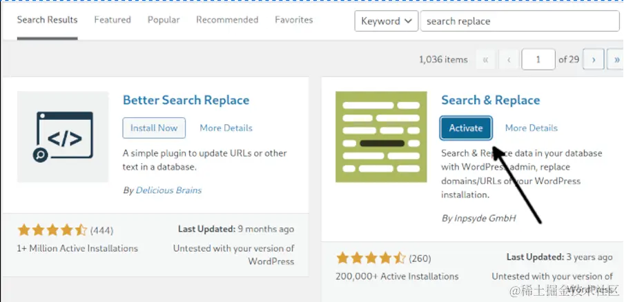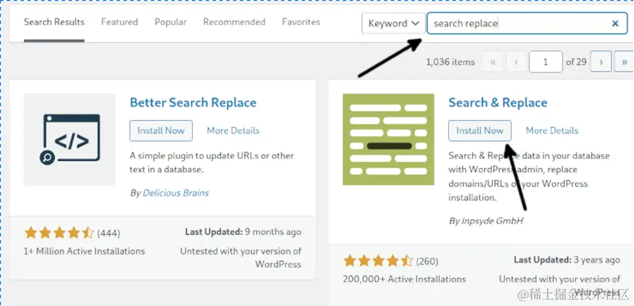 在插件安装页面,键入*"搜索替换 "来列出可用的插件。当搜索和替换*插件显示出来时,按 现在安装按钮。