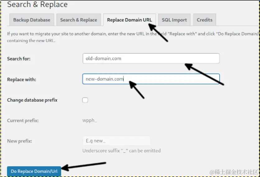在这个标签上,你会看到两个字。 搜索和 替换为.在 搜索字段中输入旧的URL,在 替换为字段中键入你的新URL。完成后按 替换域名/URL按钮。