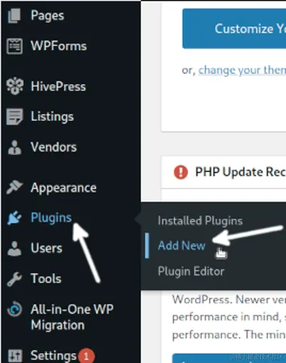 要安装它,请在仪表板的左侧菜单上将鼠标光标移至 插件,然后按 添加新的选项 (插件>添加新的).