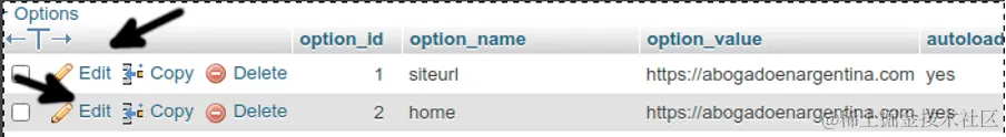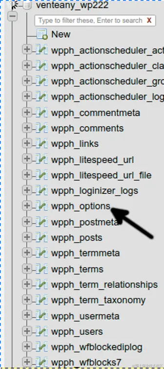 要开始,访问你的phpMyAdmin,在左边的菜单上找到 wpX_options.其中X是你的数据库标识符。按下它来显示相关的表,以改变你的URL。