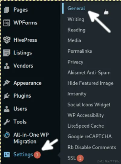 要从仪表板上改变WordPress的域名,把你的鼠标光标移到左边菜单的设置选项上,然后按 常规(设置>一般设置).