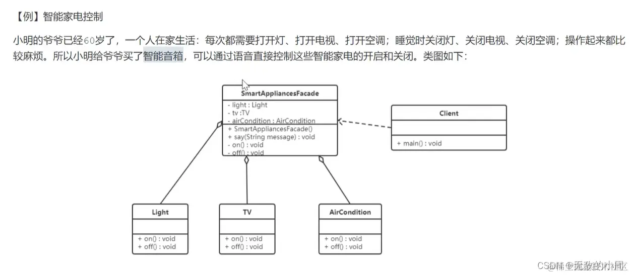 package mode; public class Client{ public static void main(String[] args) { SmartAppliancesFacade saf = new SmartAppliancesFacade(); saf.say("帮我打开电视不咋"); } } //子系统角色 class Light{ public void on(){ System.out.println("开灯"); } public void off(){ System.out.println("关灯"); } } //子系统角色 class TV{ public void on(){ System.out.println("打开电视机"); } public void off(){ System.out.println("关闭电视机"); } } //子系统角色 class AirCondition{ public void on(){ System.out.println("打开空调"); } public void off(){ System.out.println("关闭空调"); } } //外观类 class SmartAppliancesFacade{ //聚合电灯对象,电视对象,空调对象 private Light light; private TV tv; private AirCondition airCondition; public SmartAppliancesFacade() { light = new Light(); tv = new TV(); airCondition = new AirCondition(); } //通过语音控制 public void say(String message){ if(message.contains("打开")){ on(); }else if(message.contains("关闭")){ off(); }else { System.out.println("请您再说一遍"); } } //一键打开功能 private void on(){ light.on(); tv.on(); airCondition.on(); } //一键关闭方法 private void off(){ light.off(); tv.off(); airCondition.off(); } }