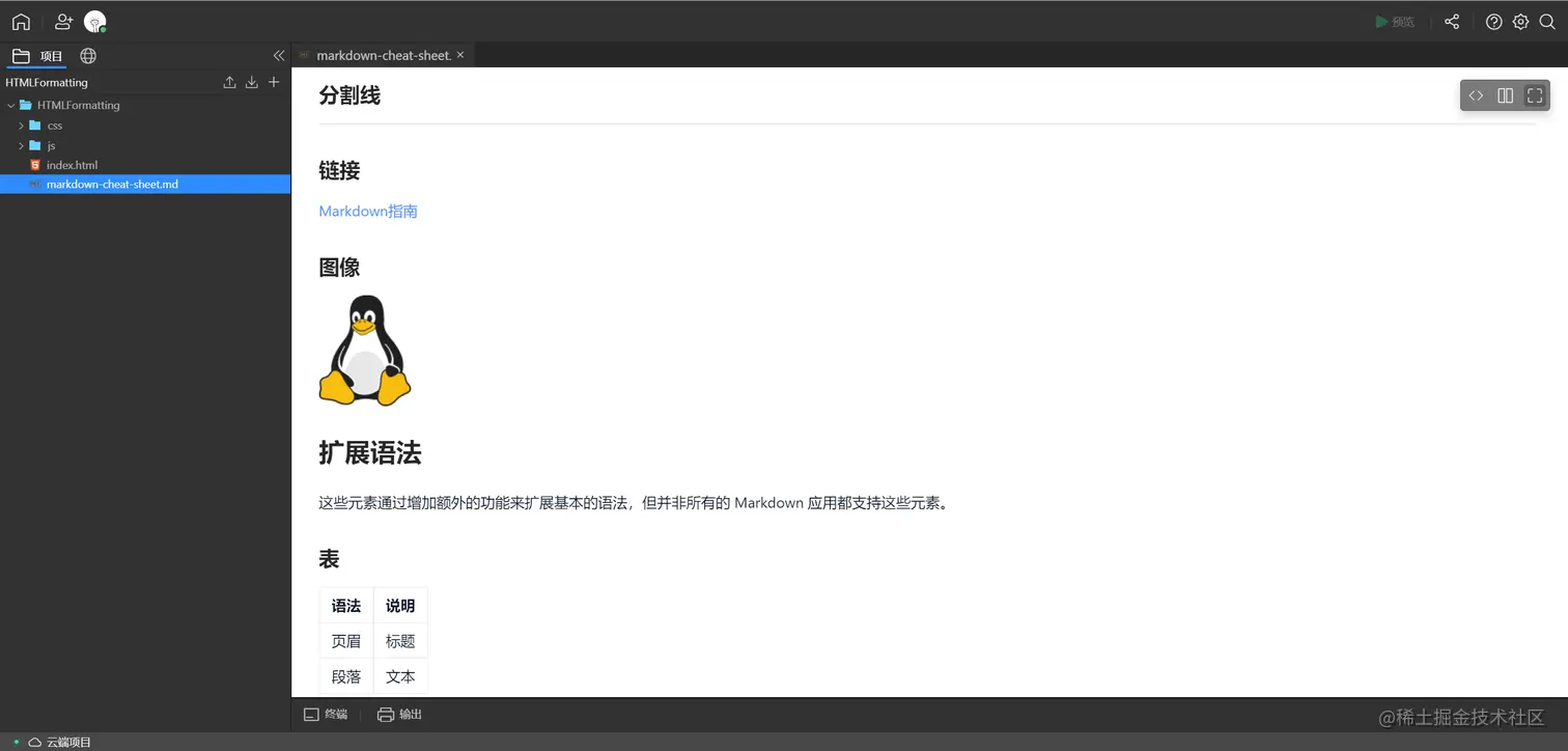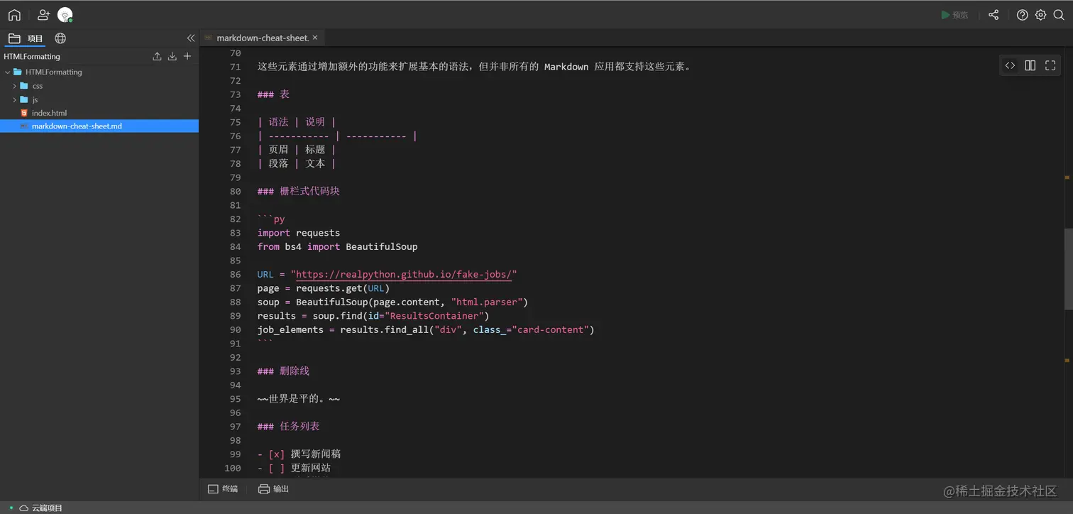 除了这些部分,Lightly 的 Markdown 编辑器也支持图片、代码块插入等,完整的 Markdown 语法,可直接在 Lightly 中的 markdown-cheat-sheet.md 文件查看:ca4ee02ebf-share.lightly.teamcode.com