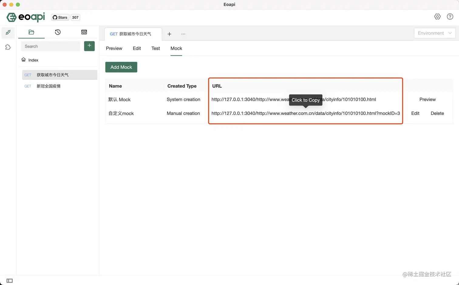 进入 Mock 列表页面,点击调用地址即可复制到剪贴板,在代码中直接对该 API 地址发起请求即可得到响应结果。