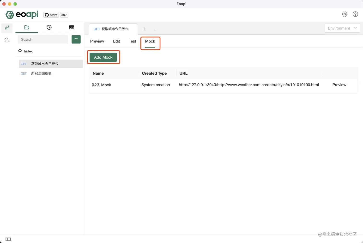 进入API文档详情页面,点击 Mock 标签,点击新建 Mock:
