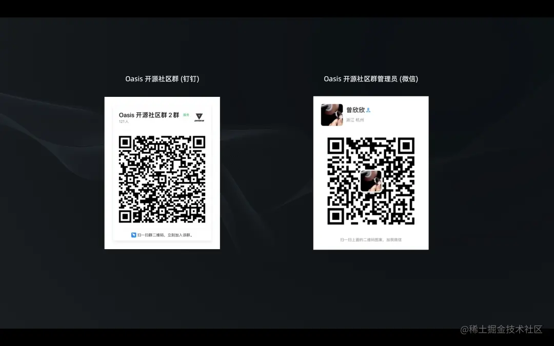 最后,明年年初我们的 Oasis 编辑器和方舟组件都会对外开源,感兴趣的小伙伴可以加入我们的钉钉社区,也可以扫码添加微信管理员微信,加入我们的微信群。感谢各位的关注,我们下次再会。