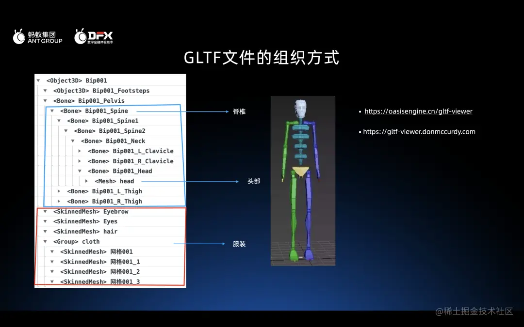 其次,后续会提到换装捏脸等技术,所以在这个阶段就需要和美术约定要命名规范,包括骨骼节点,蒙皮,材质的名称,后续的算法都需要根据名称来处理模型的数据。最后,美术会导出 glTF 文件给到前端同学,前端同学的所有开发工作都是基于 glTF 文件展开。
