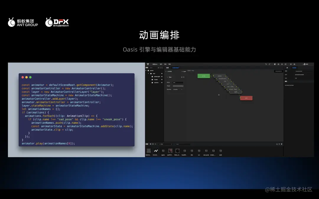 通过代码可以使用 Oasis 提供的 Animator 动画控制器组件,但这样并不直观,在编辑器中,我们特别设计了动画编排的页面,可以通过添加动画 layer,以及条件脚本,实现复杂的动画编排逻辑。