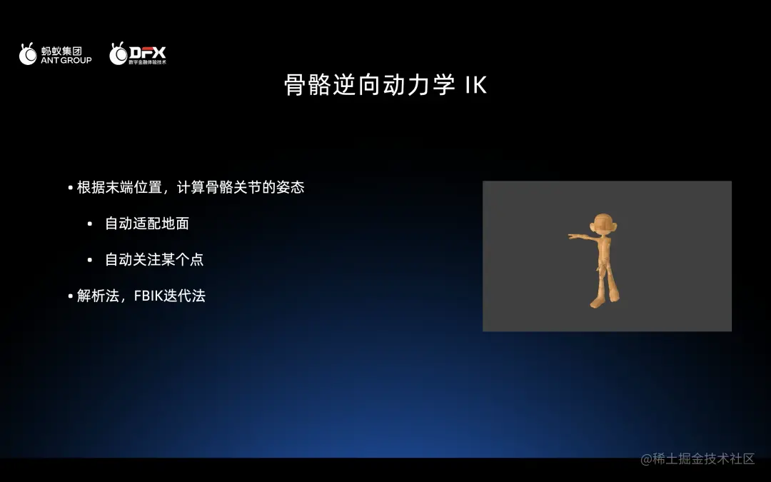上述技术我们实现了各种素材的复用,但是当把一个角色放到真实的环境当中时会带来额外的问题。例如一个跳舞的角色放在一个舞台上,舞台有一个地面,如果没有适配好,会有悬空跳舞的感觉。这时候使用逆向动力学就可以根据末端位置(脚,手,头),计算关联的骨骼关节的姿态,由此自动适配地面,或者实现关注某一点的能力。 逆向动力学的技术比较复杂,主要有两种方式,首先对于简单的情况,例如图中的例子,脚,膝盖的节点比较少,解析法很容易进行求解。但对于有多个骨骼需要计算的情况,则需要使用例如FBIK等迭代法来处理。