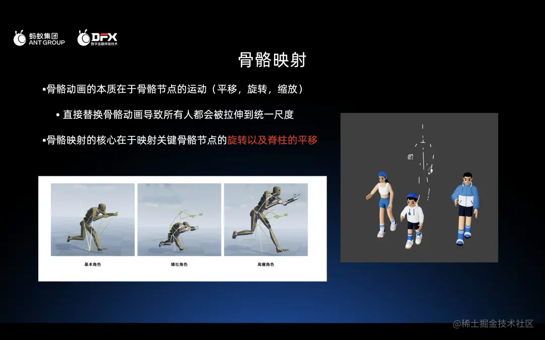 上面介绍了一系列可以替换的资产,我们再来看骨骼动画的替换。如果直接将骨骼动画放在各种各样体型的人体上,由于骨骼动画包含了平移和缩放的信息,会使得所有人物都会被拉伸或者压缩到统一尺度上。因此,需要借助骨骼映射技术,将旋转的数据映射过来,放弃掉平移和缩放的信息,这样一来无论是胖子还是瘦子,高个还是矮个,都可以应用动画。