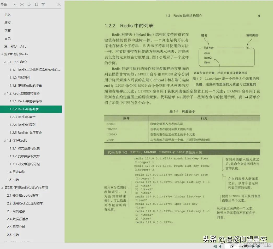 - 第一部分对Redis进行了介绍,说明了Redis的基本使用方法、它拥有的5种数据结构以及操作这5种数据结构的命令,并讲解了如何使用Redis去构建文章聚合网站、cookie、购物车、网页缓存、数据库行缓存等一系列程序。