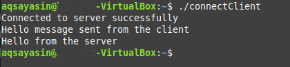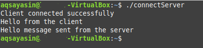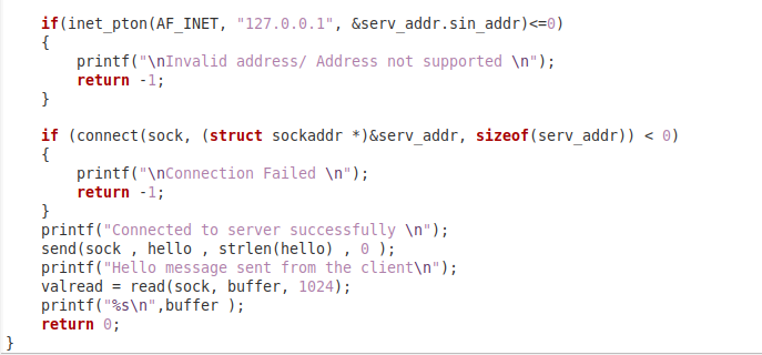 在客户端包含了必要的库和头文件后,我们已经声明了所需的变量和我们要发送给服务器的信息,作为这个交互的一部分。然后,我们用一些函数来寻找所有可能的错误。之后,我们有了 "connect "函数,在这个函数中我们试图连接到服务器。这个函数包含了相关的套接字和客户端想要连接的服务器地址作为其参数。如果连接成功,一个消息将被打印在终端的客户端。最后,客户端和服务器将相互交换信息。为了实现这种互动,我们使用了C语言的 "send() "和 "read() "函数。