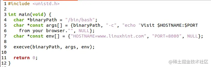 然后在主程序中,提供了一个二进制路径,然后将其作为常量参数。参数中的其他参数包括主机名和端口号。常量环境由网站地址组成。在使用execve系统调用时,二进制路径、参数和环境变量被作为参数使用。