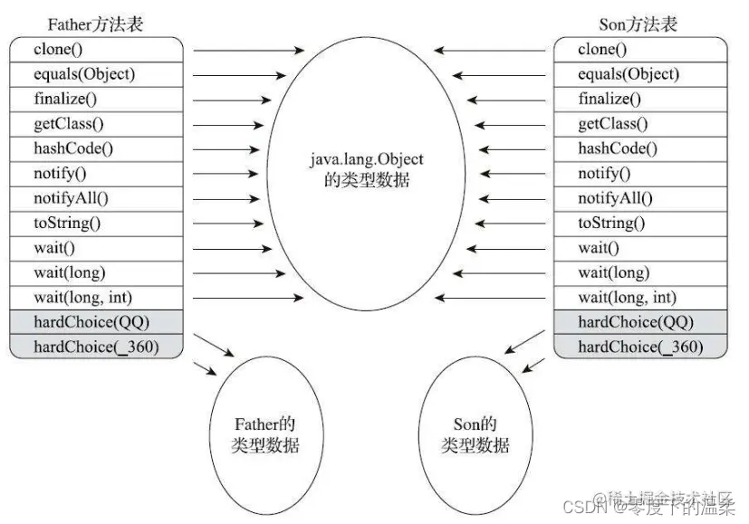 在图中,Son重写了来自Father的全部方法,因此Son的方法表没有指向Father类型数据的箭头。但是Son和Father都没有重写来自Object的方法,所以它们的方法表中所有从Object继承来的方法都指向了Object的数据类型。