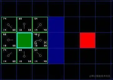 G = 从起点 A 移动到指定方格的移动代价,沿着到达该方格而生成的路径。 H = 从指定的方格移动到终点 B 的估算成本。这个通常被称为试探法,有点让人混淆。为什么这么叫呢,因为这是个猜测。直到我们找到了路径我们才会知道真正的距离,因为途中有各种各样的东西 ( 比如墙壁,水等 ) 。本贴将以一种较为简单的方式估算H,你也可以在网上找到其他方法。