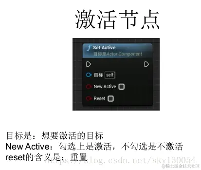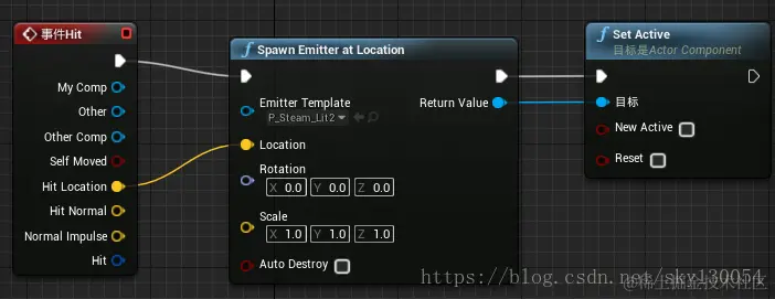 添加“Spawn Emitter at Location”节点(使物体产生碰撞时能够产生粒子效果)和“SetActive”节点(使粒子效果过一会儿消失),并将“Spawn Emitter at Location”节点的“Emitter Template”属性选择为需要的粒子效果。