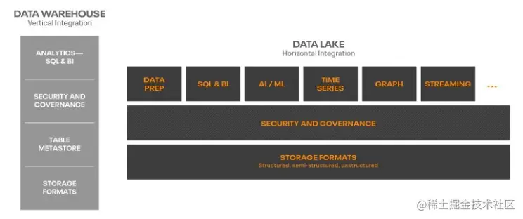 数据湖和数据仓库将大量和各种数据统一到一个中心位置。但是有着截然不同的建筑世界观。数据仓库是为 SQL 分析垂直集成的,而数据湖优先考虑 SQL 之外的分析方法的灵活性。