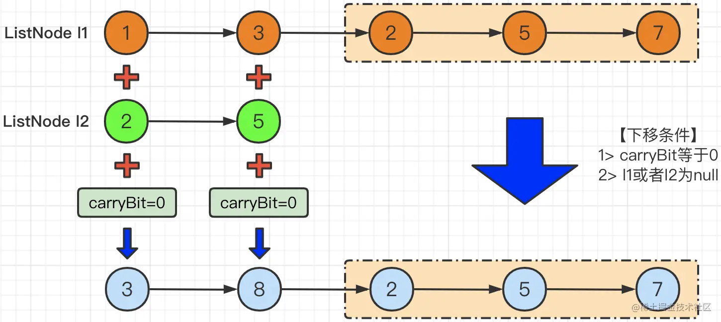 看完这道题,第一个想法就是,按位进行相加操作,并将结果保存新的节点中,即:new ListNode(l1.val + l2.val)。那么如果相加的总和大于9的话,则需要执行进位操作,我们这里使用int carryBit来保存进位值(默认为0,进位则被赋值为1)。所以,新节点的创建其实应该是new ListNode(l1.val + l2.val + carryBit)。 如下图所示: