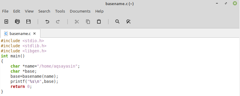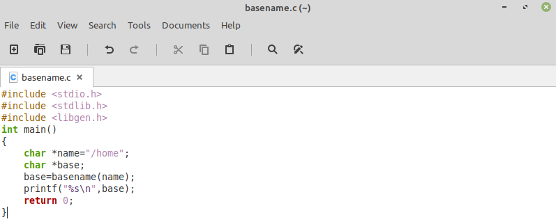 为了方便地使用Basename函数,我们将 "libgen.h "头文件与常规的 "stdio.h "和 "stdlib.h "头文件放在一起。之后,在我们的 "main() "函数中,我们声明了一个字符类型的指针,并给它分配了只包含"/"的路径。然后,我们声明了另一个字符类型的指针,并将其等同于Basename函数的值,我们已经将包含所需路径的指针分配给了该函数。最后,我们在终端机上打印了后一个变量的值,然后是 "返回0 "语句。