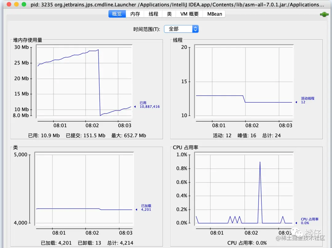 概览:包括堆内存使用情况、线程、类、CPU使用情况四项信息的曲线图。