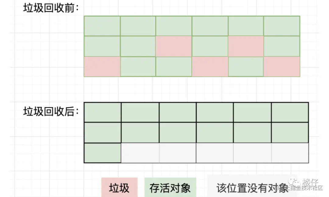标记--整理算法算是一种折中的垃圾收集算法,在对象标记的过程,和前面两个执行的是一样步骤。但是,进行标记之后,存活的对象会移动到堆的一端,然后直接清理存活对象以外的区域就可以了。这样,既避免了内存碎片,也不存在堆空间浪费的说法了。但是,每次进行垃圾回收的时候 ,都要暂停所有的用户线程,特别是对老年代的对象回收,则需要更长的回收时间,这对用户体验是非常不好的。