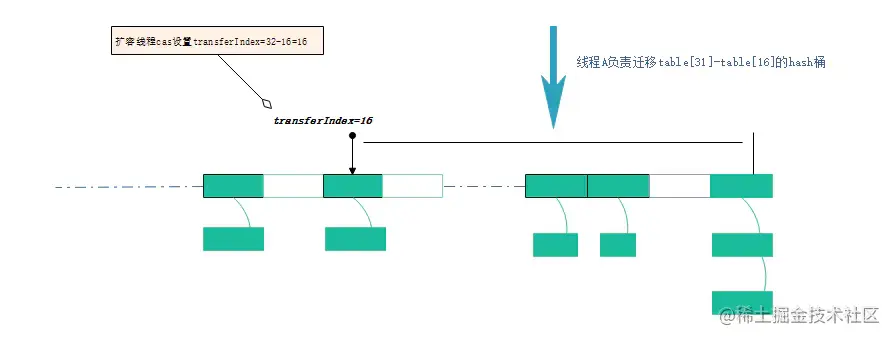 扩容线程A 以cas的方式修改transferindex=31-16=16 ,然后按照降序迁移table[31]--table[16]这个区间的hash桶