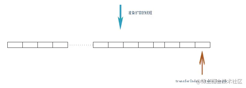 在扩容之前,transferIndex 在数组的最右边 。此时有一个线程发现已经到达扩容阈值,准备开始扩容。