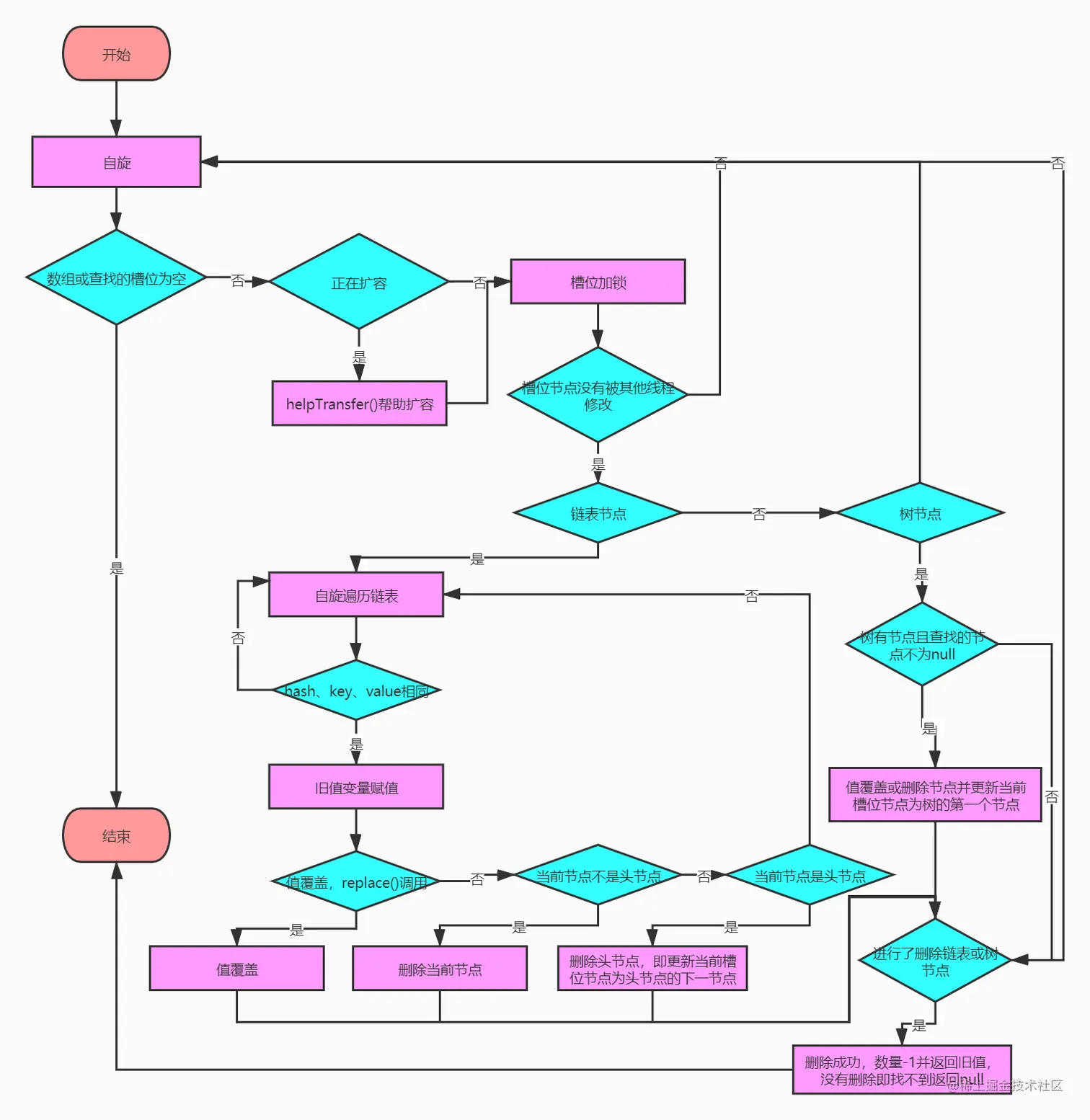 - 如果该槽位节点还是没有任何变化,判断是链表结构类型节点还是树结构类型节点,通过遍历查找元素,找到删除该节点或重新设置头节点;