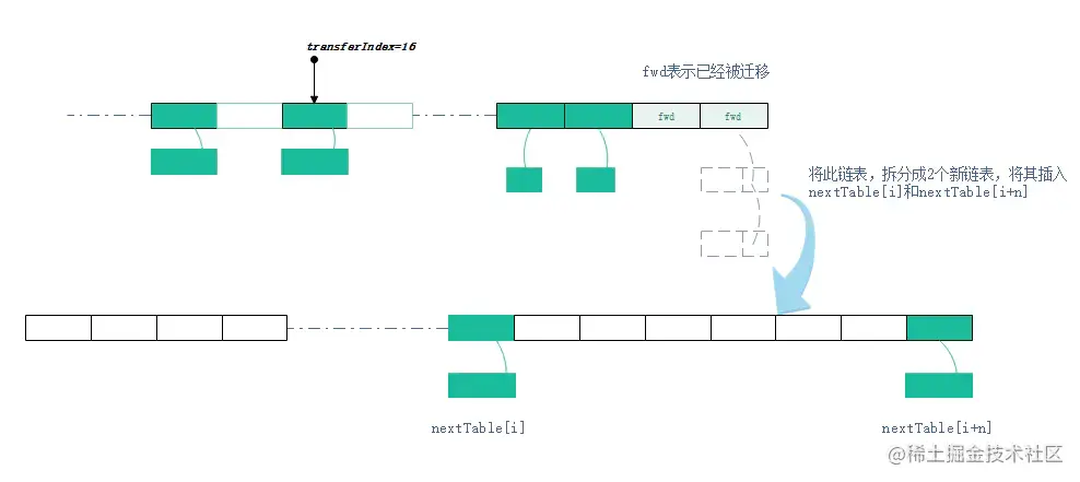 迁移hash桶时,会将桶内的链表或者红黑树,按照一定算法,拆分成2份,将其插入nextTable[i]和nextTable[i+n](n是table数组的长度)。 迁移完毕的hash桶,会被设置成ForwardingNode节点,以此告知访问此桶的其他线程,此节点已经迁移完毕